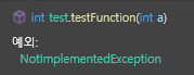 public class test : ITest { public int testFunction(int a) { throw new NotImplementedException(); } }<exception> 태그를 사용하면 해당 메서드를 사용할 때 IntelliSense의 예외에 출력된다.